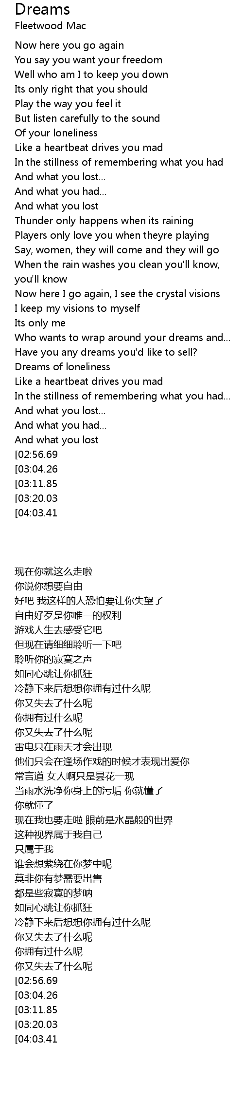 Fleetwood Mac - Dreams (Lyrics) now here you go again you say you want your freedom, Fleetwood Mac - Dreams (Lyrics) now here you go again you say you want your freedom dreams tiktok lyrics Leave some love . We Have got 11 picture about Dreams Lyrics Fleetwood Mac images, photos, pictures, backgrounds, and more. In such page, we additionally have number of images out there. Such as png, jpg, animated gifs, pic art, symbol, blackandwhite, pic, etc. "Fleetwood Mac - Dreams (Lyrics Video)", "Dreams" is a song by band Fleetwood Mac from their album Rumors (1977). recorded in 1976 and release in 4 February 1977.. "Lanie Gardner - Dreams by Fleetwood Mac (Cover)", Listen to "Dreams" by @David Guetta and @MORTEN feat. Lanie Gardner here: https://davidguetta.lnk.to/Dreams In light of one of ..
