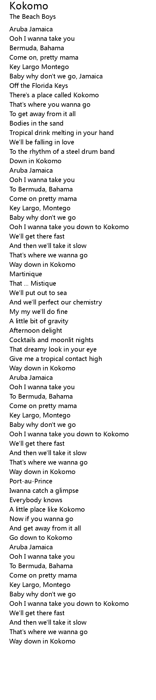 Kokomo - The Beach Boys (with lyrics), Kokomo by The Beach Boys with lyrics on screen. . We Have got 13 pics about Kokomo Lyrics images, photos, pictures, backgrounds, and more. In such page, we additionally have number of images out there. Such as png, jpg, animated gifs, pic art, symbol, blackandwhite, pics, etc. "Beach Boys - Kokomo lyrics", . "Cocktail \u2022 Kokomo \u2022 The Beach Boys", Soundtrack/theme song from the 1988 Roger Donaldson film "Cocktail" with Tom Cruise, Elisabeth Shue, Bryan Brown, Kelly ..